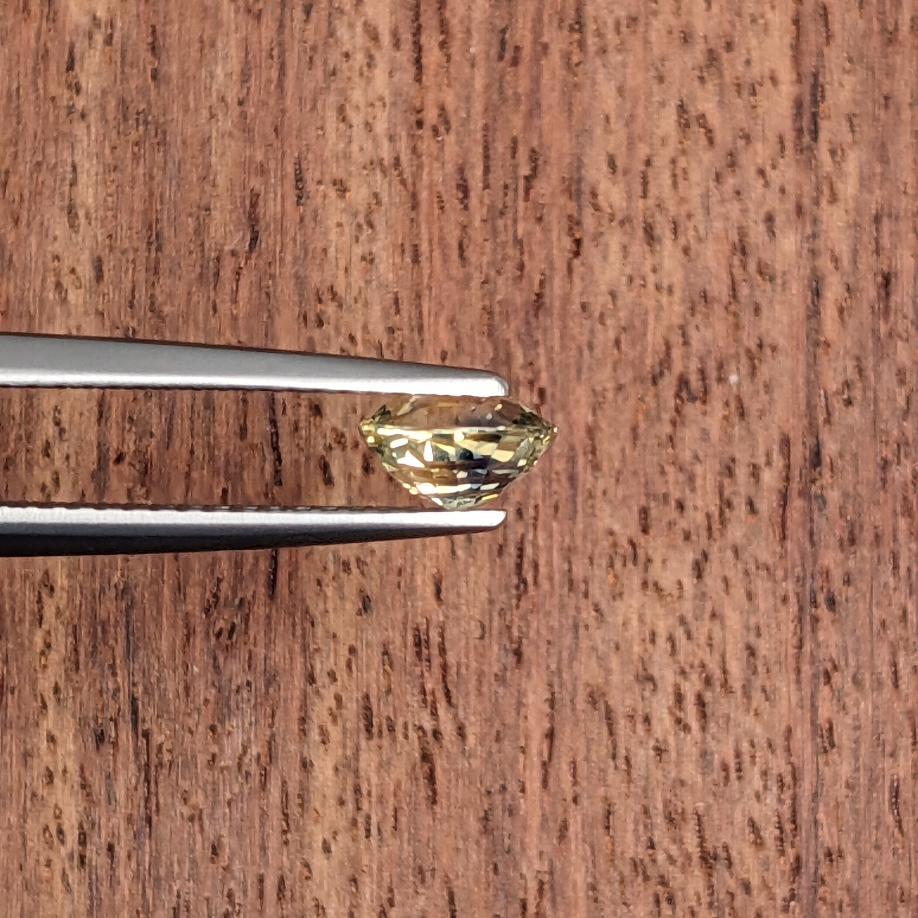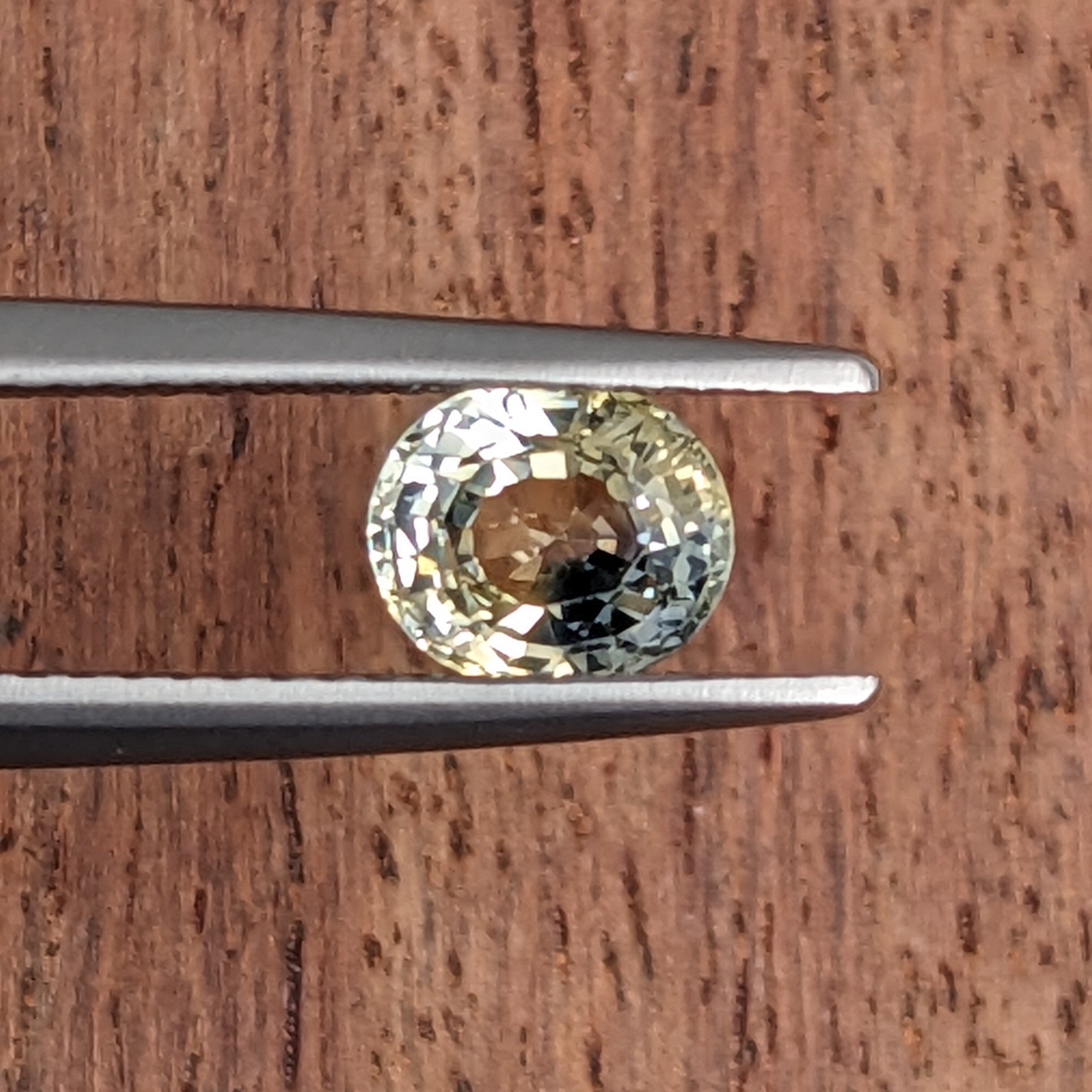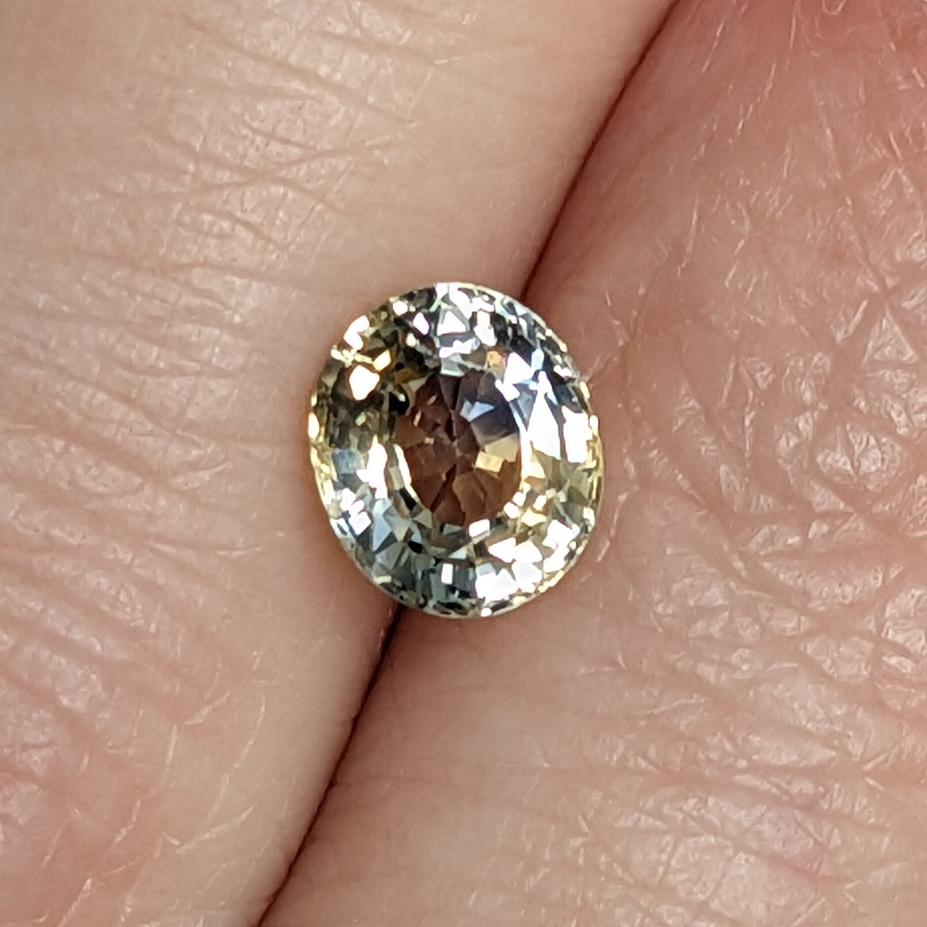 うっとりと眺めてしまう、淡いイエローとブルーの競演。バランスよく散らばった色のコントラストがとても美しい1ピースです。イエローサファイアとブルーサファイアはどちらも「鉄イオン(Fe)」が含まれて発色していますが、ブルーはそれに加えて「チタン(Ti)」も共存して発色しています。風にたなびくようにあちらにこちらにそれぞれの輝きを振りまくその様は、まるでゴッホの“小麦畑”を思い起こさせる詩的な美しさがあります。淡いとはいっても、枠にはめてもきちんと色合いを楽しめる1ピースです。