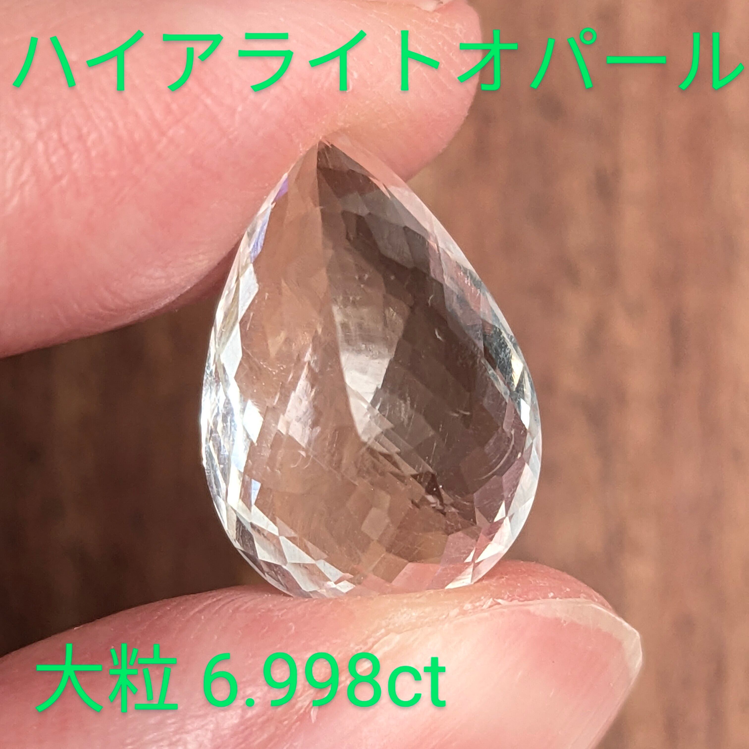 「ハイヤライトオパール」は、いわゆる“遊色の出ないオパール(コモンオパール)”の一種。中でも紫外線に当たった時に鮮やかな蛍光色を発するものにだけ付けられる特別なオパールです。今回ご紹介の6.998cの大粒のハイアライトは、蛍光も透明度の高い鮮やかなイエローグリーン。まだ穴も空いていない無垢な雫型なので、どのようにするかはあなた次第。ルーペでのぞくと独特の脈理のような渦が見え、その透明度も相まって吸い込まれてしまいそうです。和名は“玉滴石”。まさに地球の涙のようにしずく状に産出する希少石です