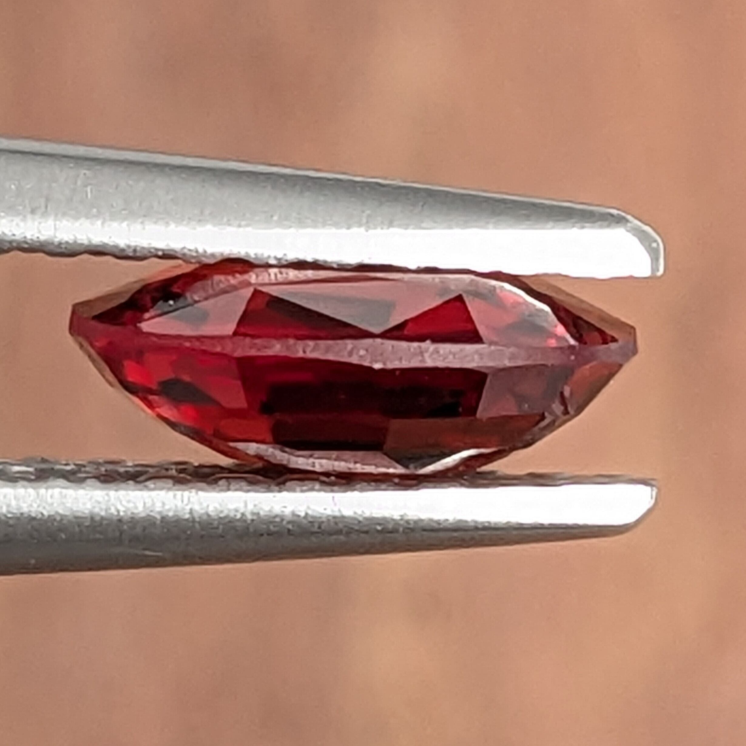 温かく、色彩鮮やかなオレンジ味をかんだ赤色がとても美しい1ピース。スピネルはどの角度から見ても一定の色合いに見える宝石なので、リングでもネックレスでも加工しやすいのも特徴です。