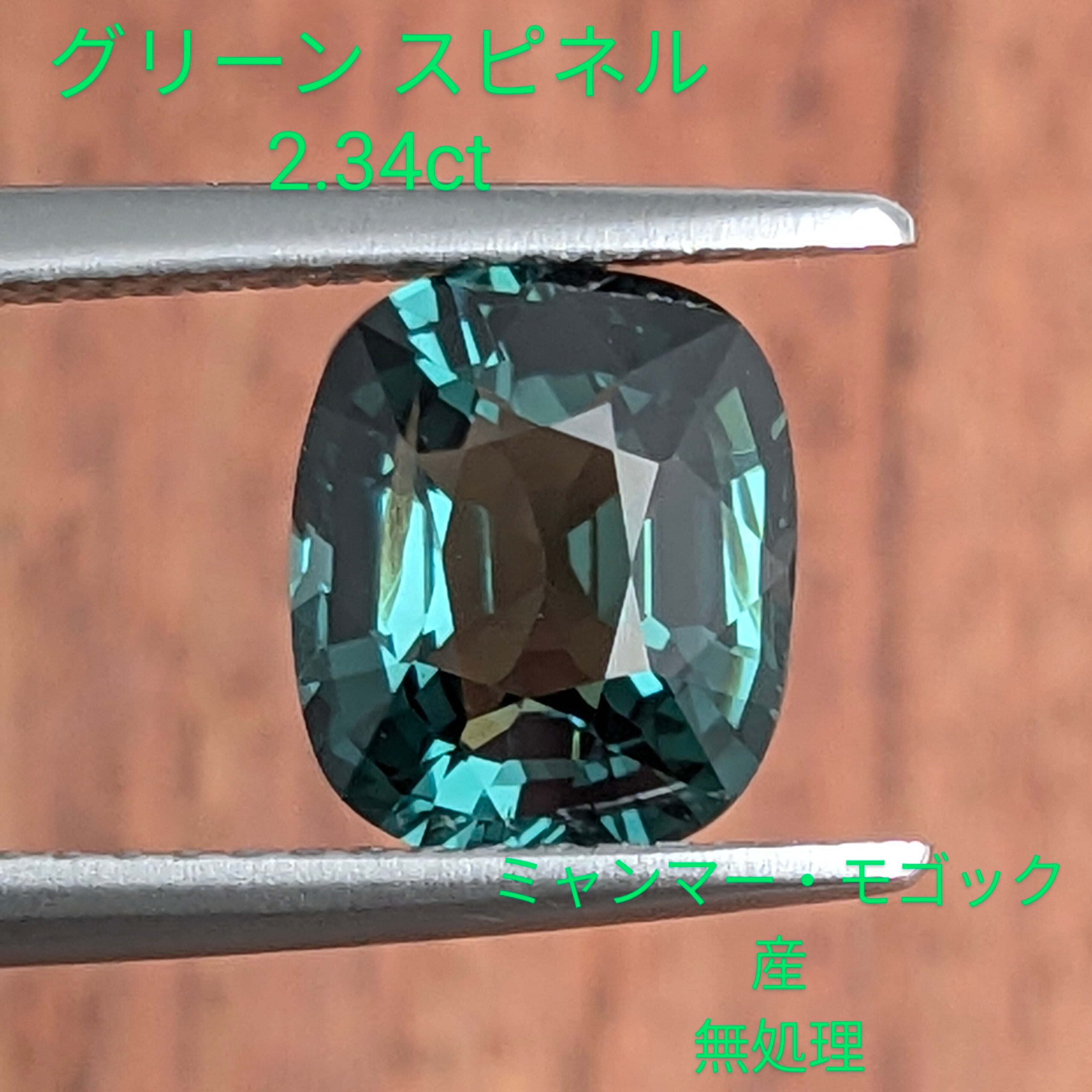 意外とレアなこのグリーンスピネル。ちょうどブルーとグリーンの間の深い色合いが魅力的です。動画でもうっすら見えますが、端のほうに白いフェザーが入っていますが、全体的にはクリアな印象です。