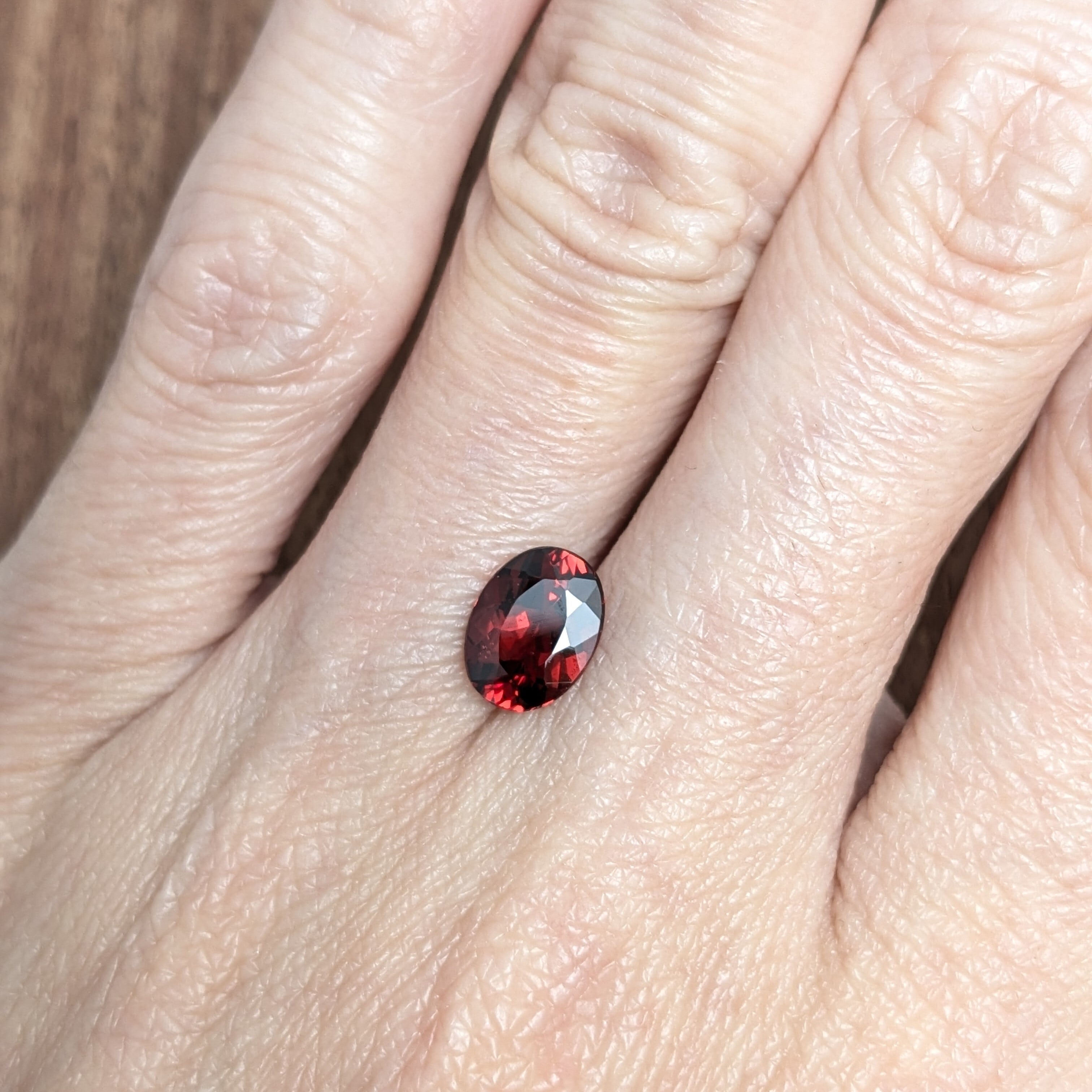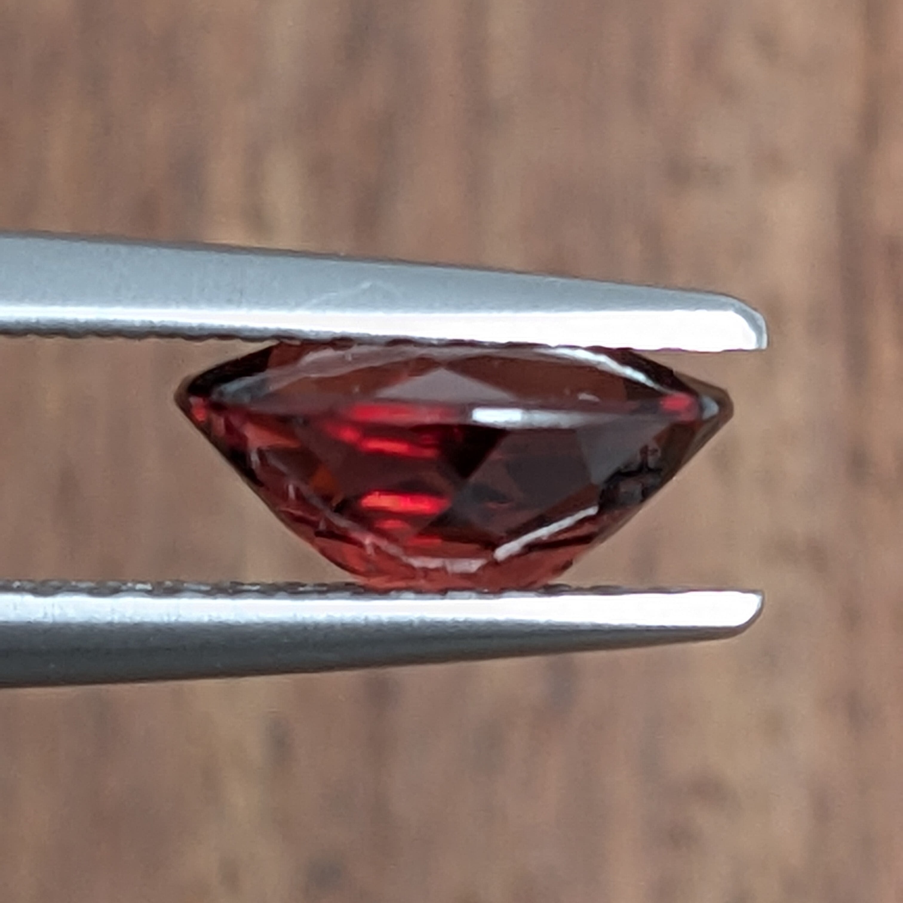 アルマンダイト系ですが、ブラウン味が少なく赤色が美しい1粒。枠に留めても暗すぎず、きちんと色を感じる彩度があります。横向きに配置したデザインでもキュートに仕上がりそう☆