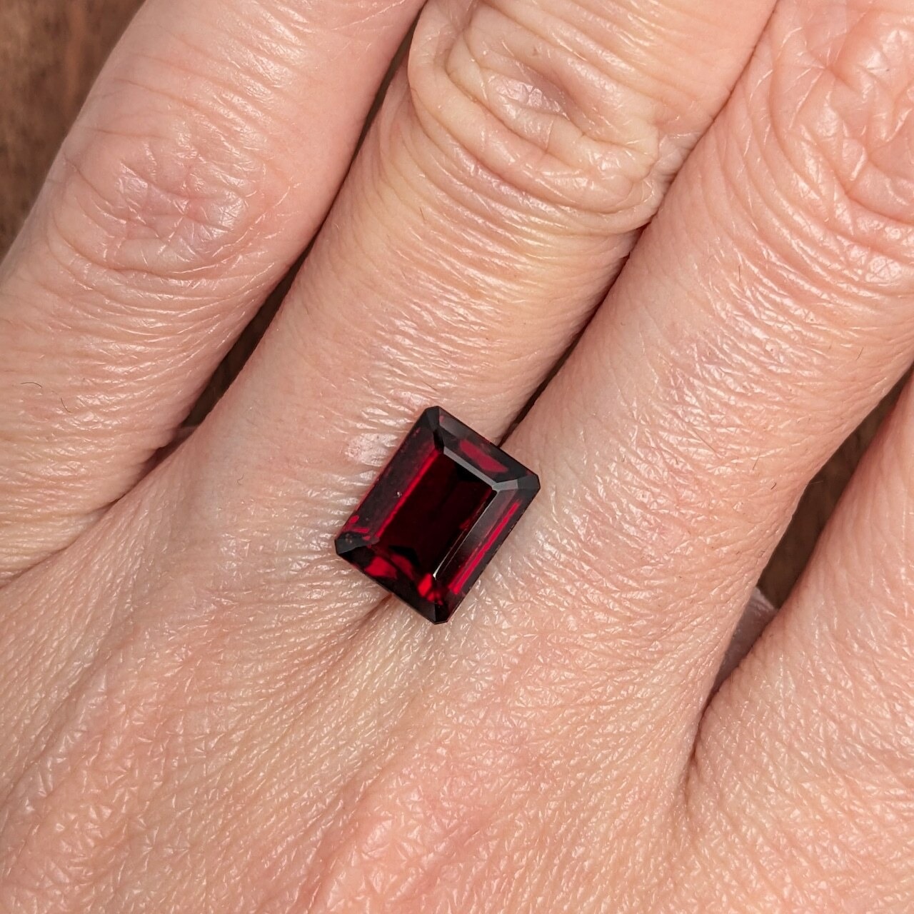 深紅といっても過言ではない深い赤色が、クールなスクエアカットにされている、最高にカッコいい1粒。動くたびに煌めく濃淡の赤色が私たちを魅了します。