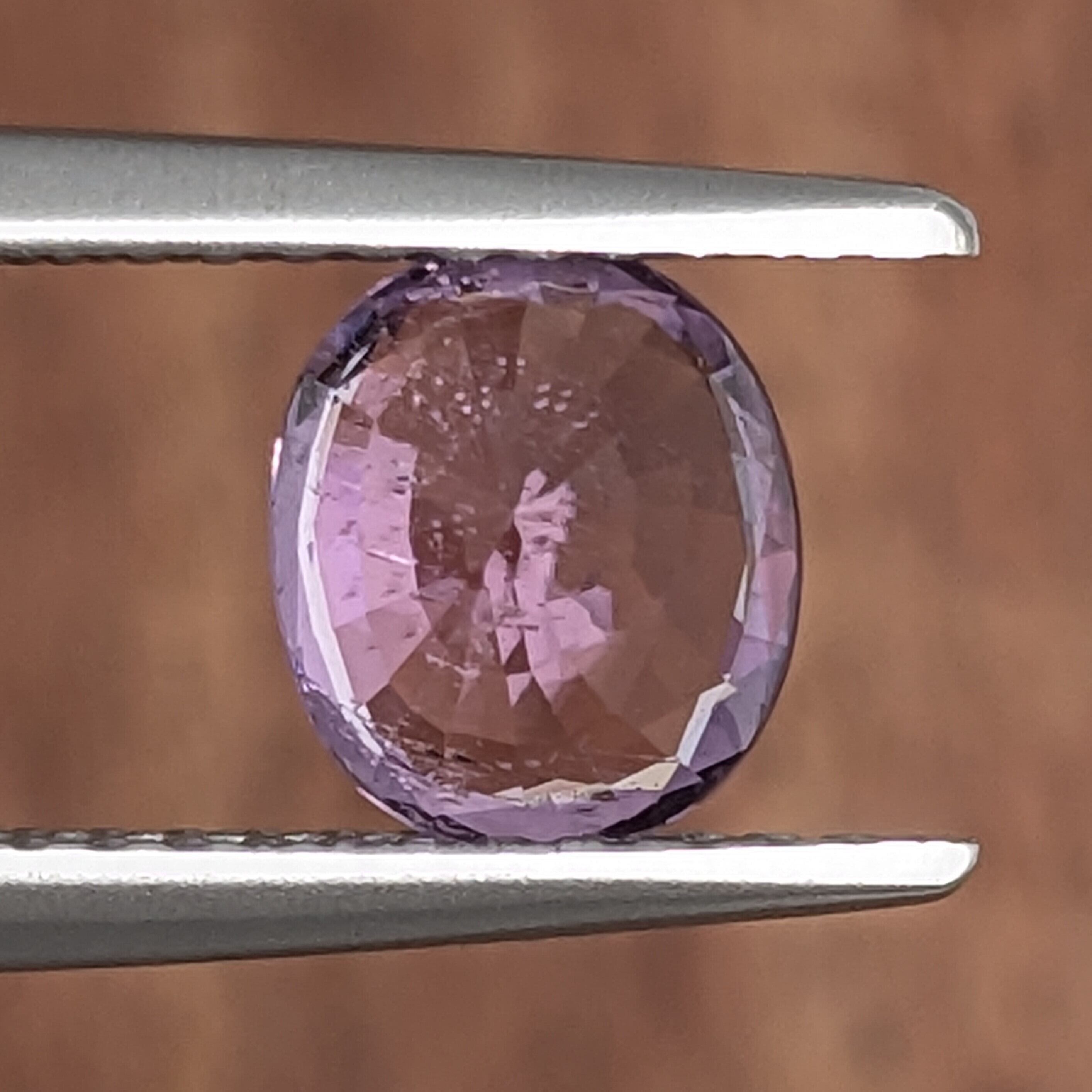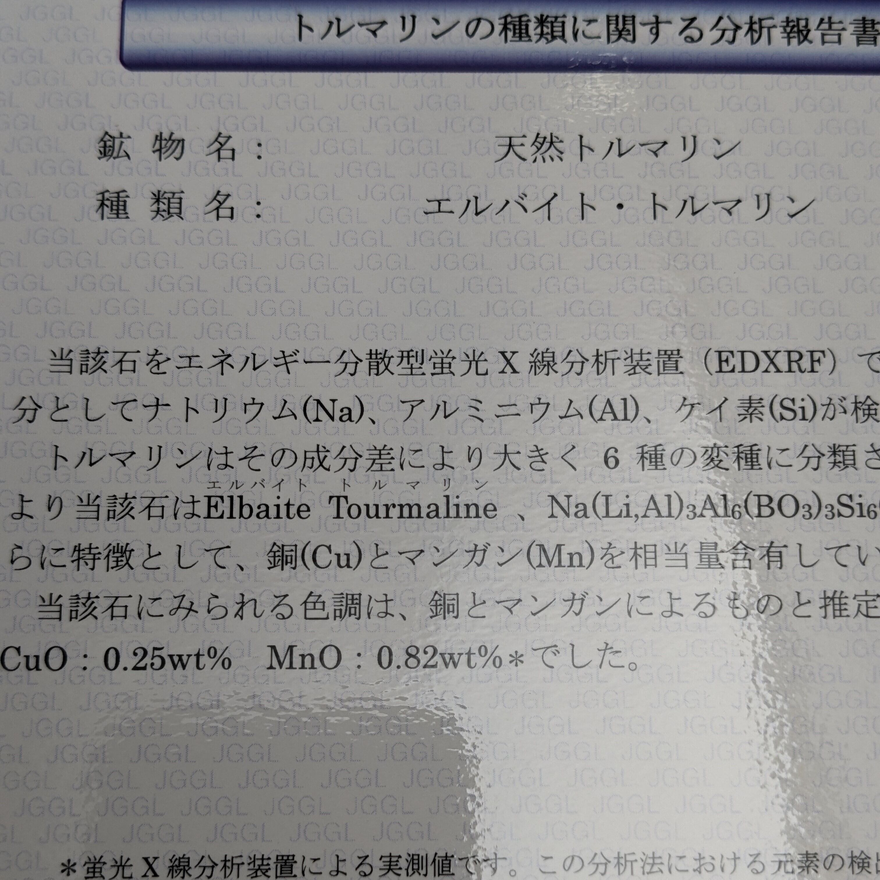 パライバトルマリンと同じ「エルバイト・グループ」で、かつ色の原因も「Cu(銅)」と「Mn(マンガン)」でありながら、美しい藤色をした1ピース。トルマリンマニアには見逃せない逸品です。