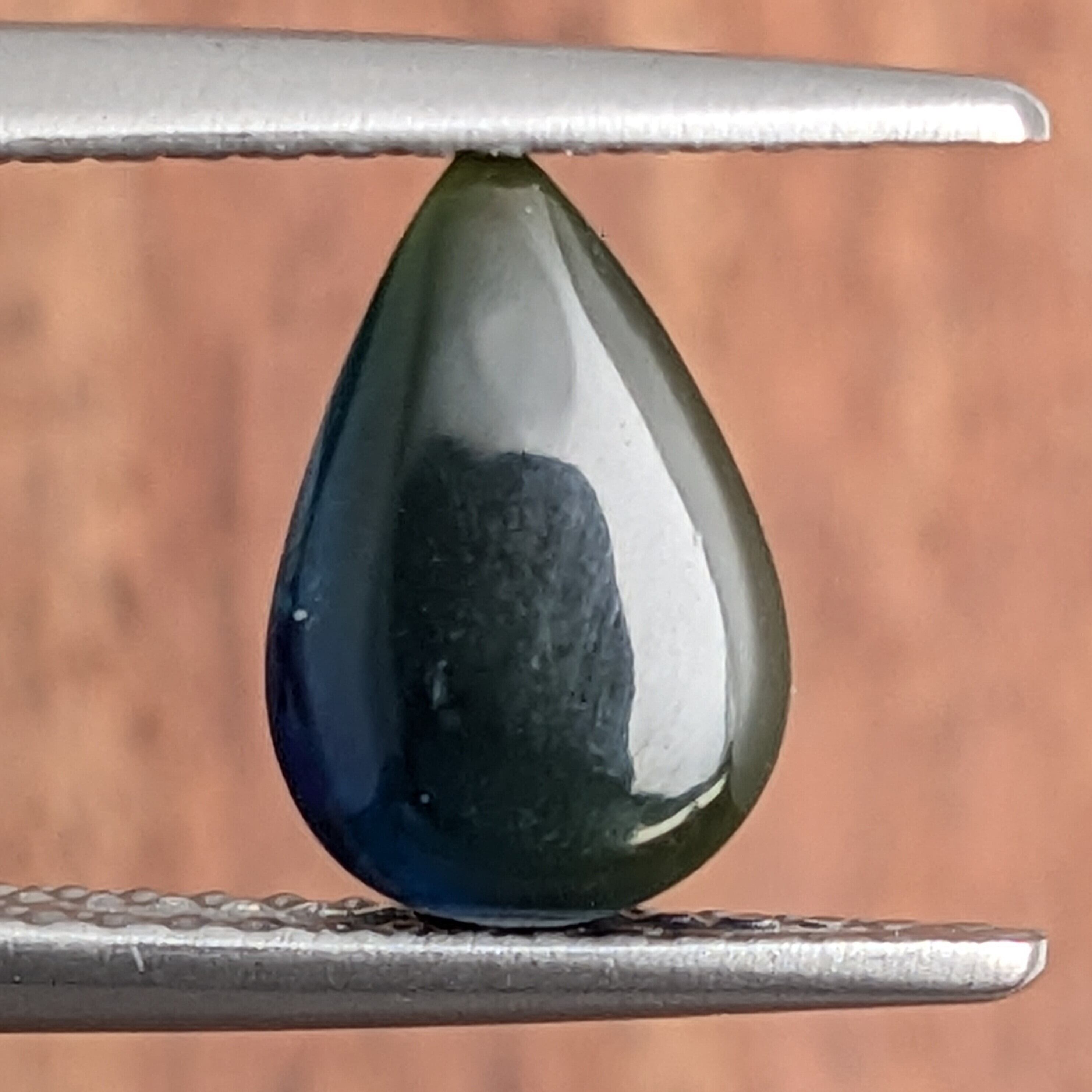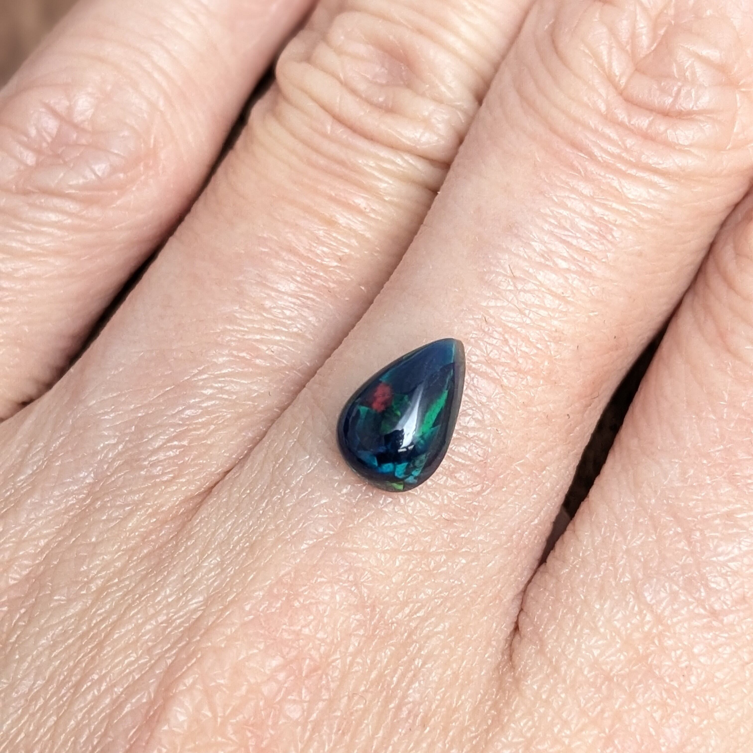 つるりと磨かれた石の表面に、稲妻のようにグリーンとブルーの閃光が踊る1粒。角度によってチラリと赤色~橙色の煌めきも見られます。艶々の一粒です。