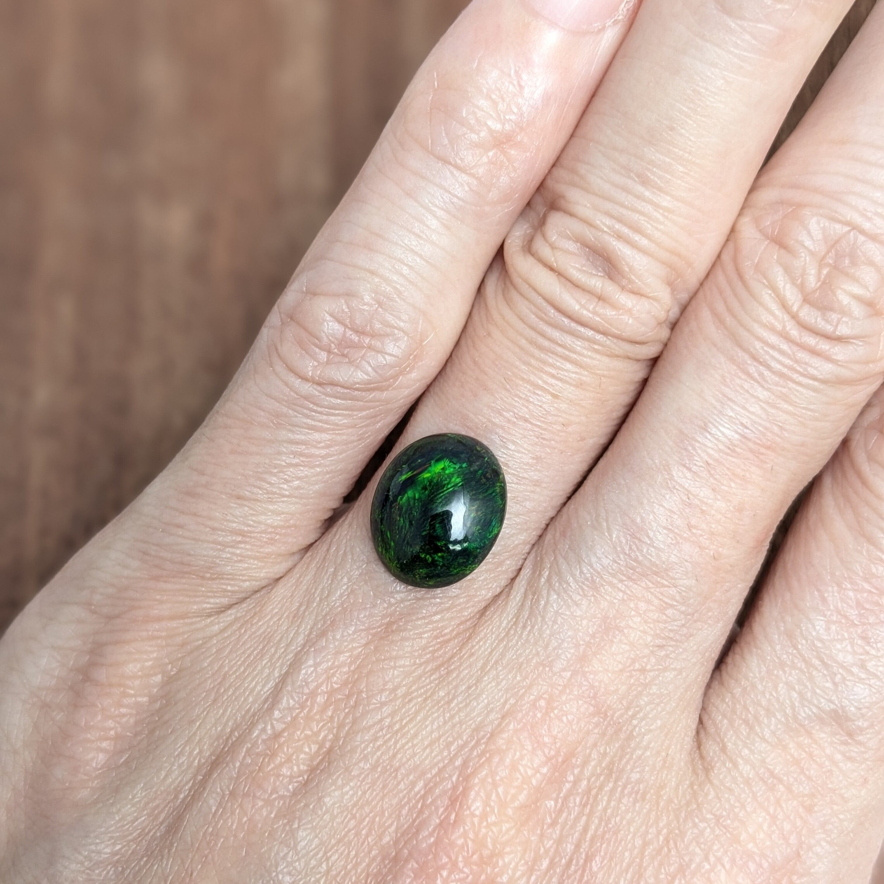 ミレーの描くオフィーリアを思い出させる、複雑に絡み合った緑色の遊色が魅力的な一粒。わずかに散った花びらのように、角度によって赤色やイエローの煌めきが見えるのもまた雰囲気が出ています。