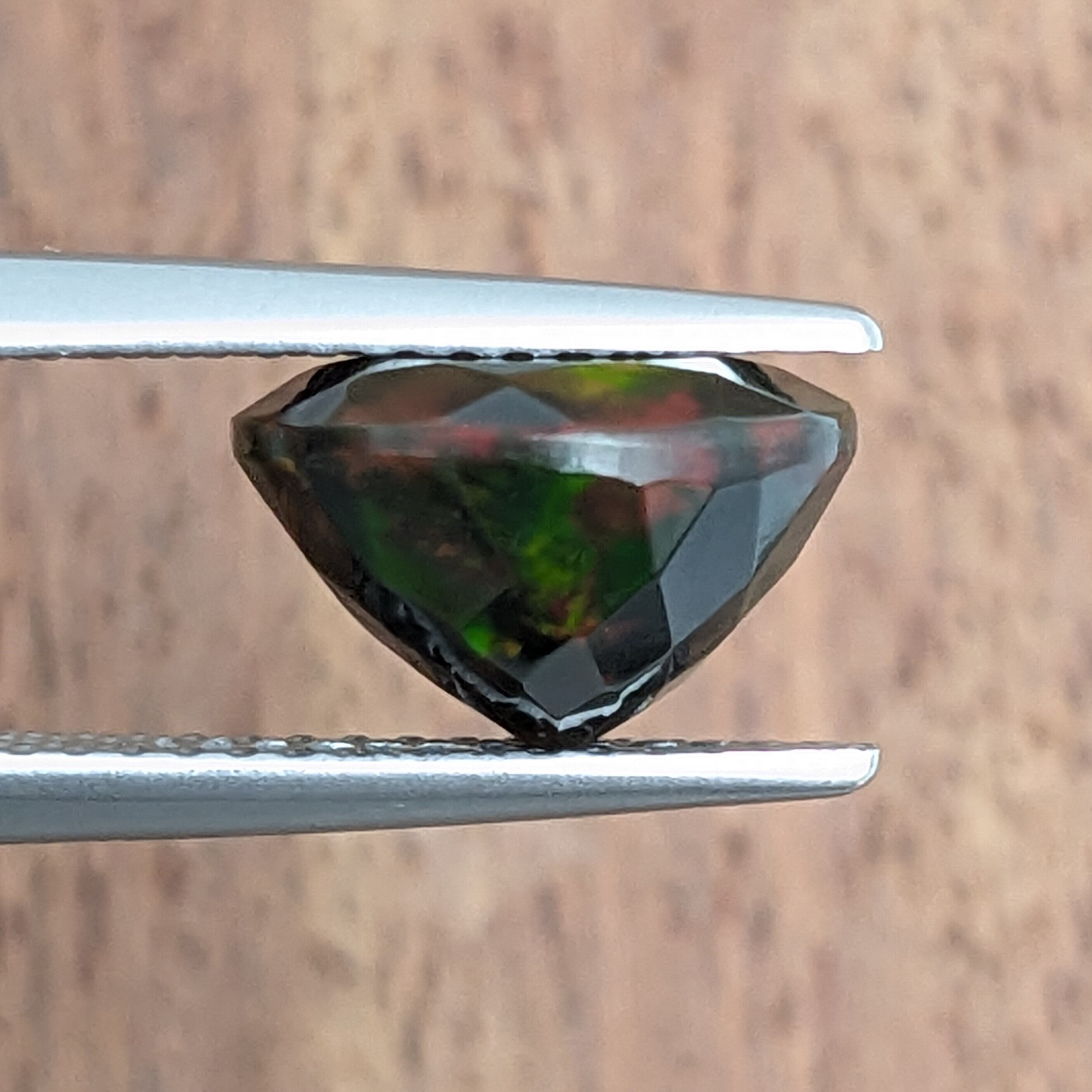 南極の夜空を気ままに彩るオーロラのように、ユラユラと赤~緑へとその色彩が揺れる1ピース。ブラックですが、エチオピアオパールの水分多めの特性だからこその透明感のある雰囲気が素敵です。