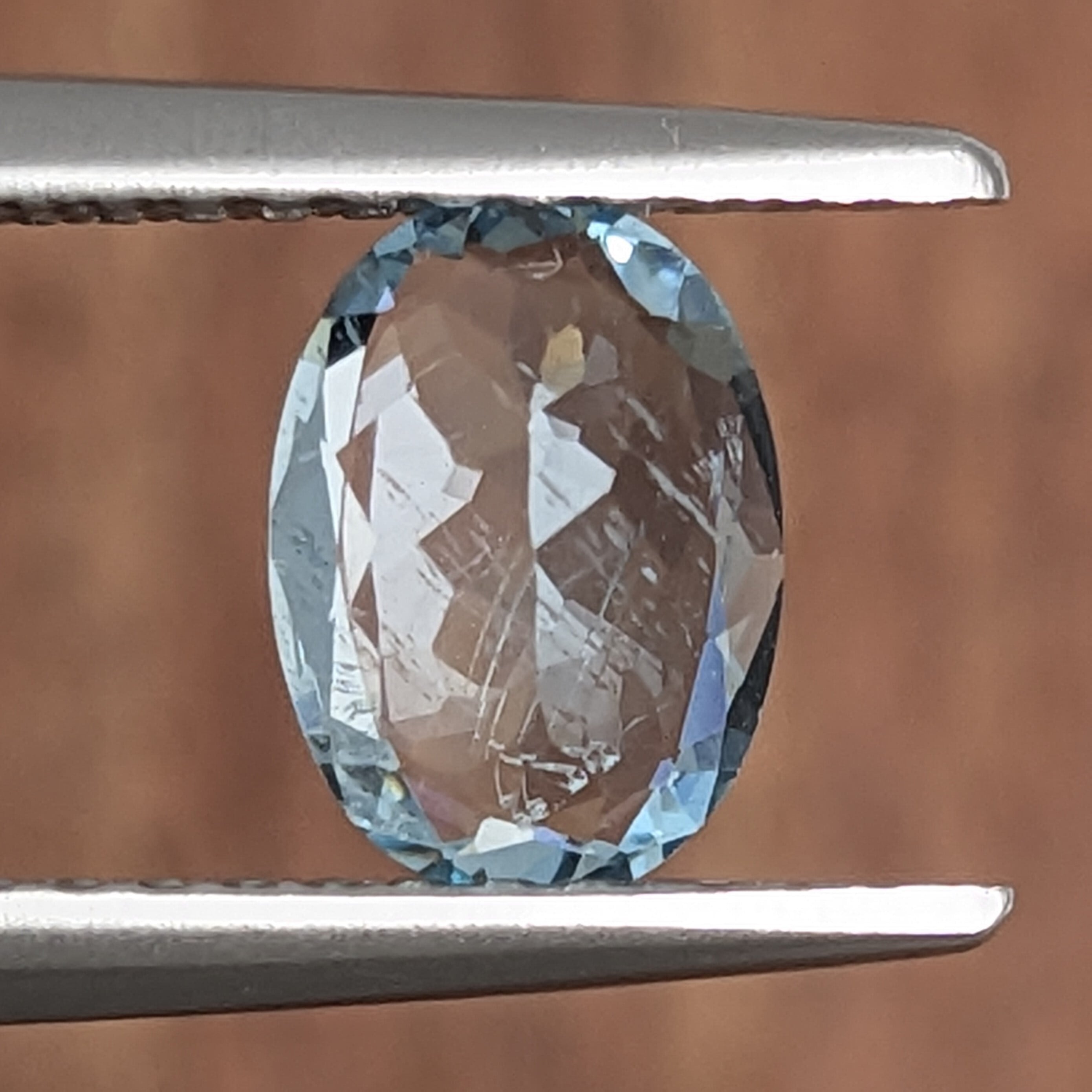 スッキリと澄み渡った青空を思わせる爽やかな輝き。そっと内部をルーペで覗くと、不意に訪れた天気雨が太陽の光の中で煌めくような、心がちょっと踊る液体インクルージョンの存在が素敵です☆