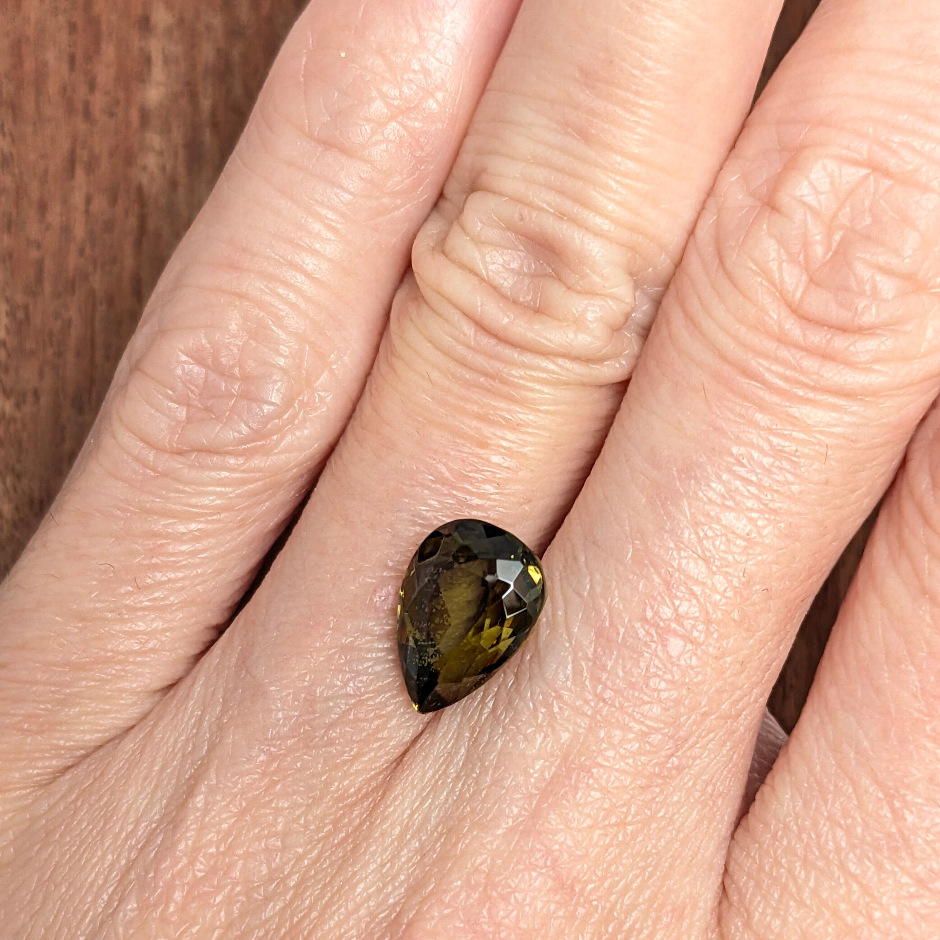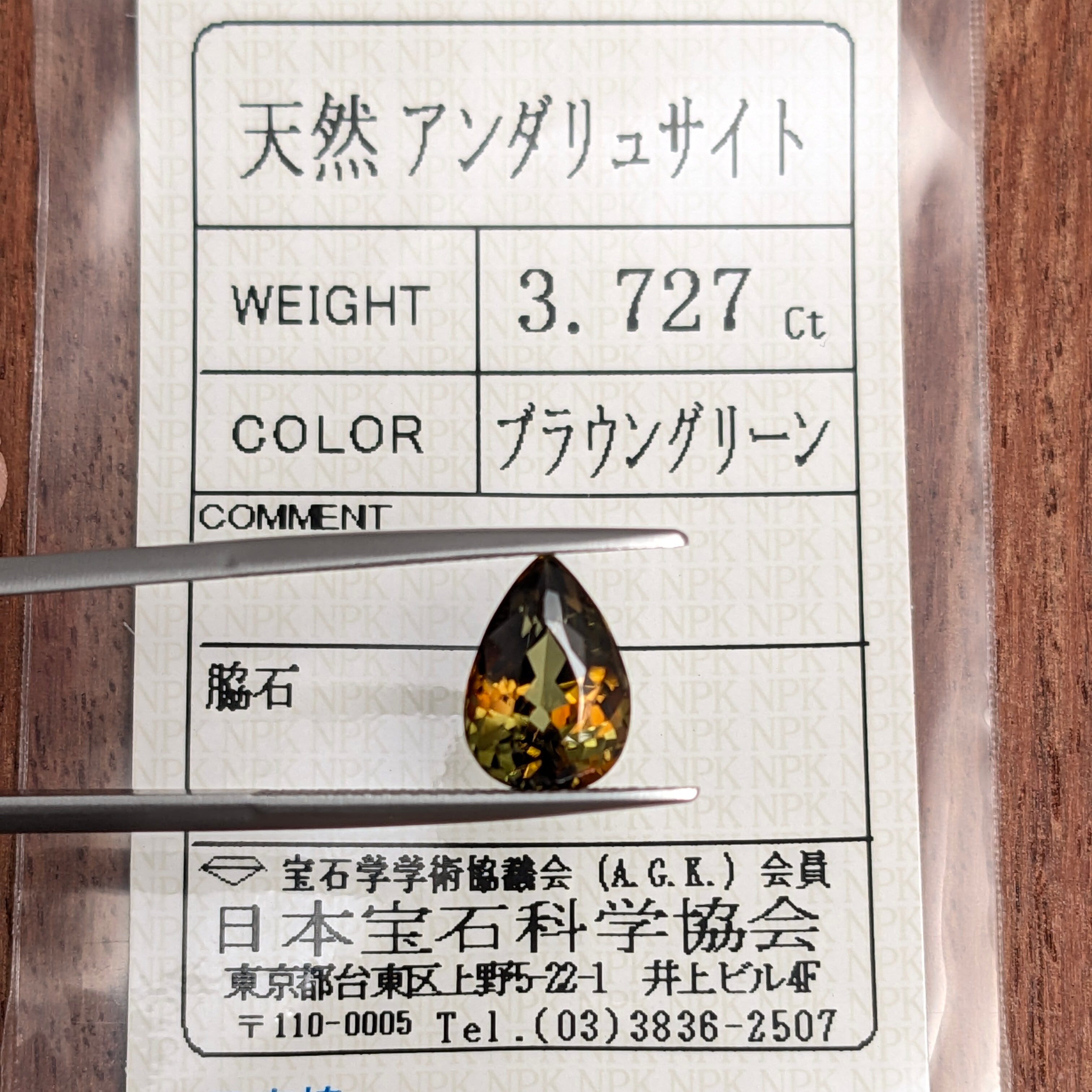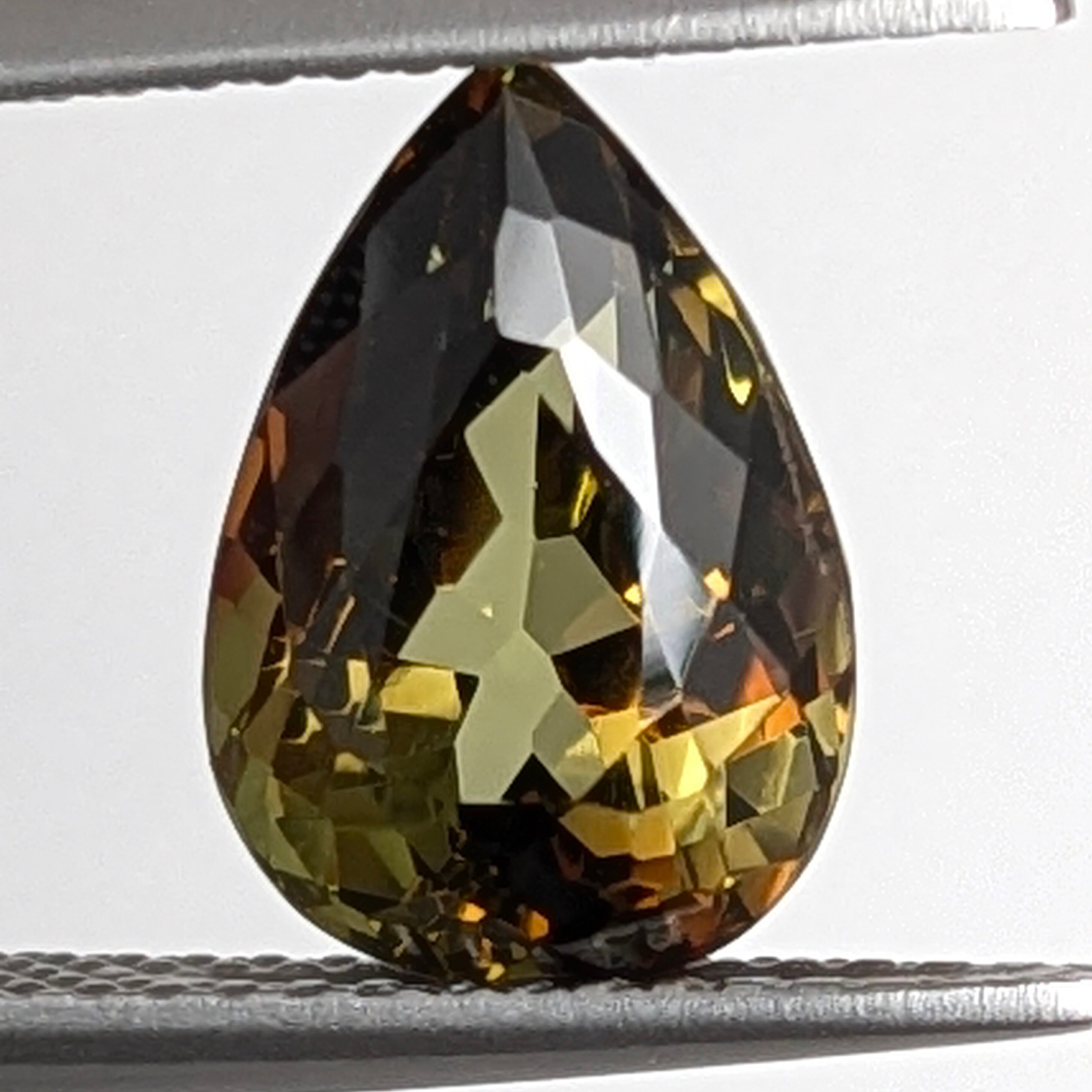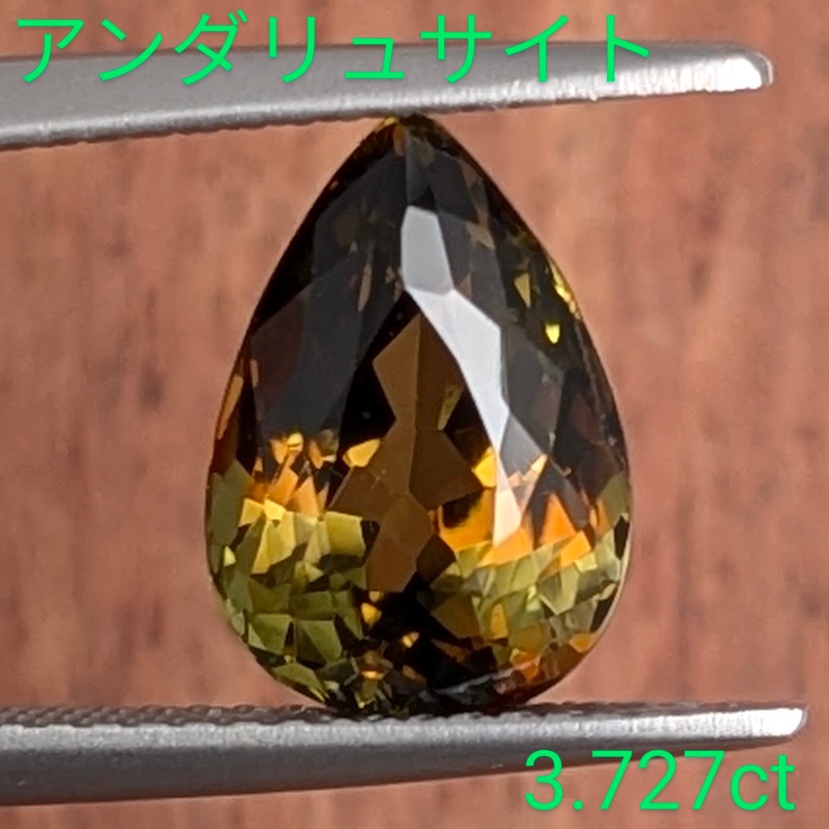 見る角度によってグリーン~ブラウン~オレンジ色と多彩な輝きを見せる宝石。「多色性」という性質が強いため、正面からでも複数の色が見えるとても神秘的な美しさを持つ1粒です。