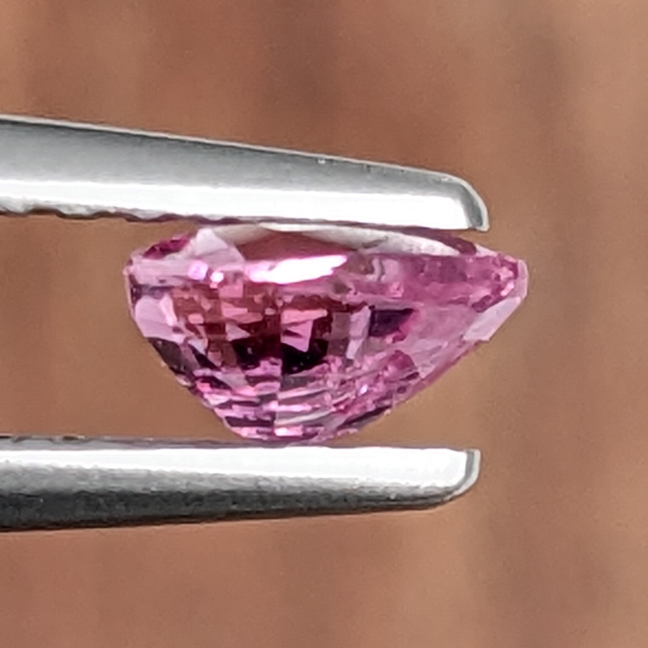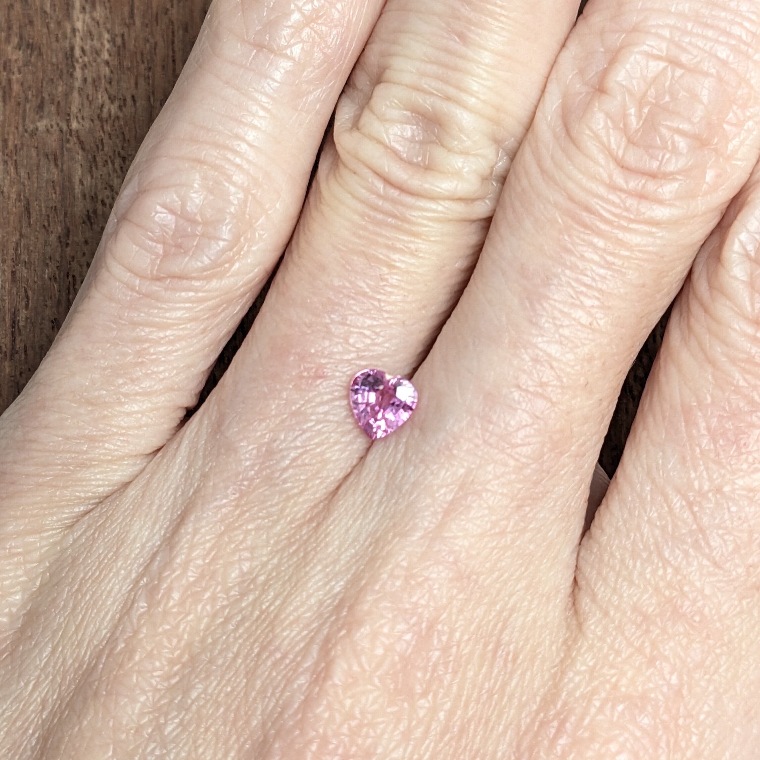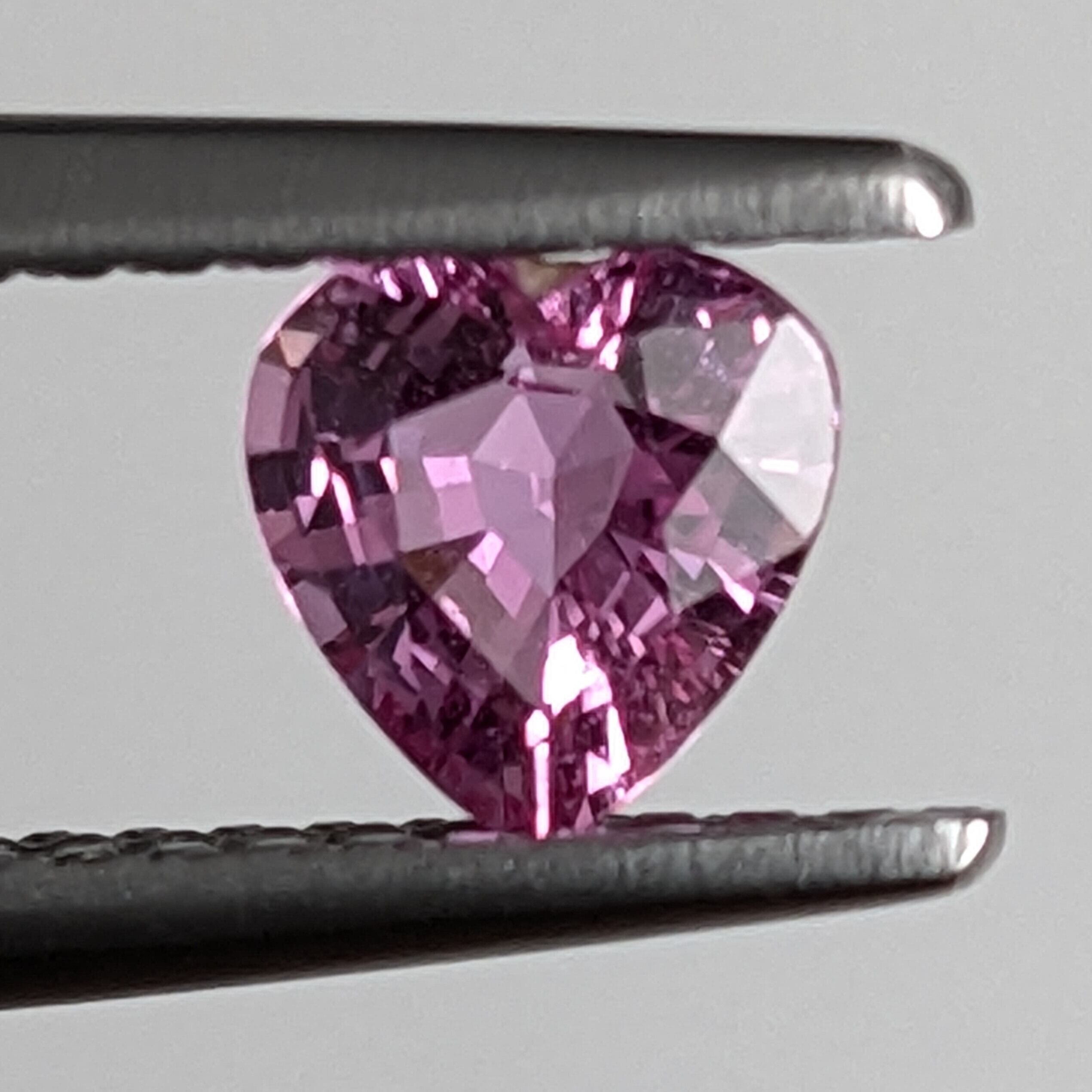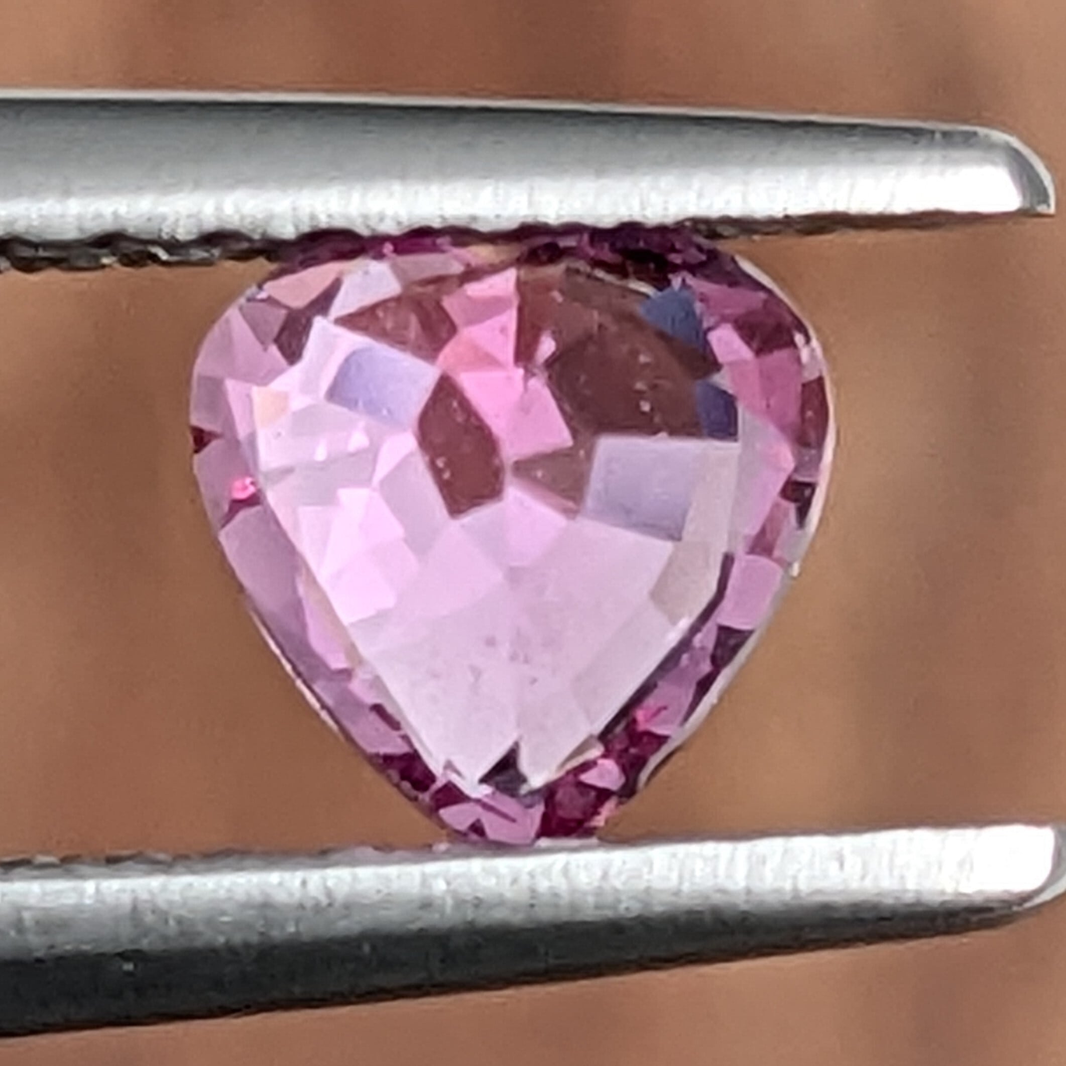 心ときめくピンク色に目を奪われる1粒。ハートシェイプって、どうしてこんなにときめくのだろう!細かなインクルージョンが若干散らばって入っていますが、肉眼では輝きや色合い、その美しさを妨げるようなものではありません。