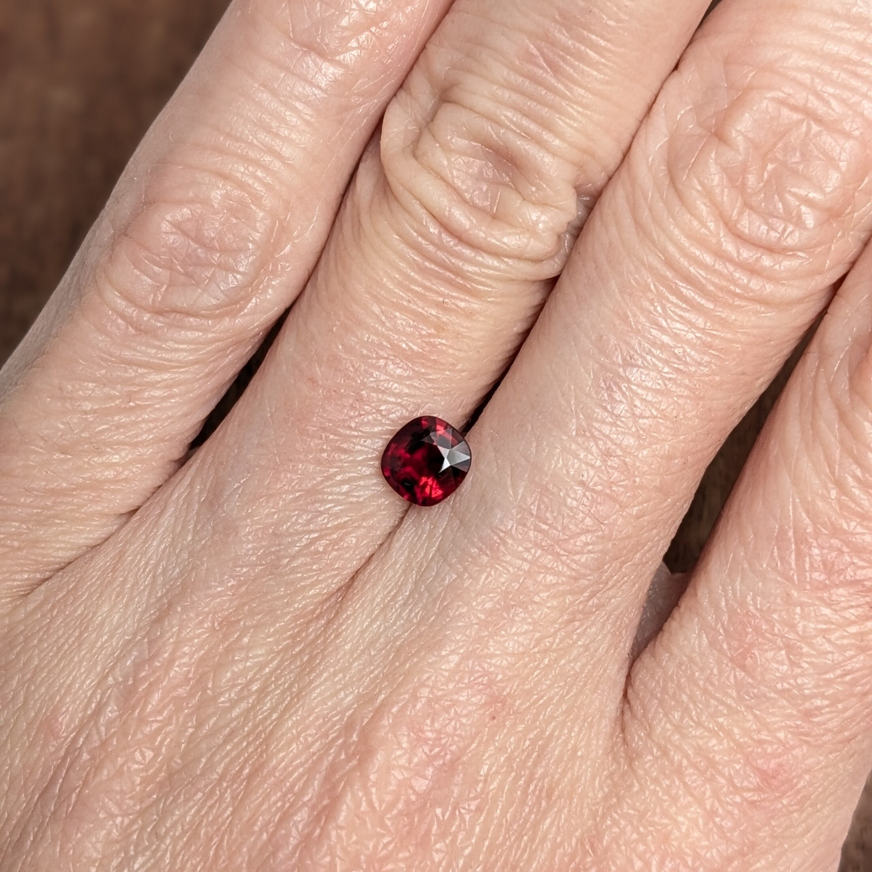 とてもクリアで、カットバランスも良い1ピース。スピネルの硬質で安定した美しい赤色は、まるでその色の精霊が宿っているかのような魅力があります。肌に添えると、パッとそこだけスポットライトが当たっているような華やかさが感じられます。