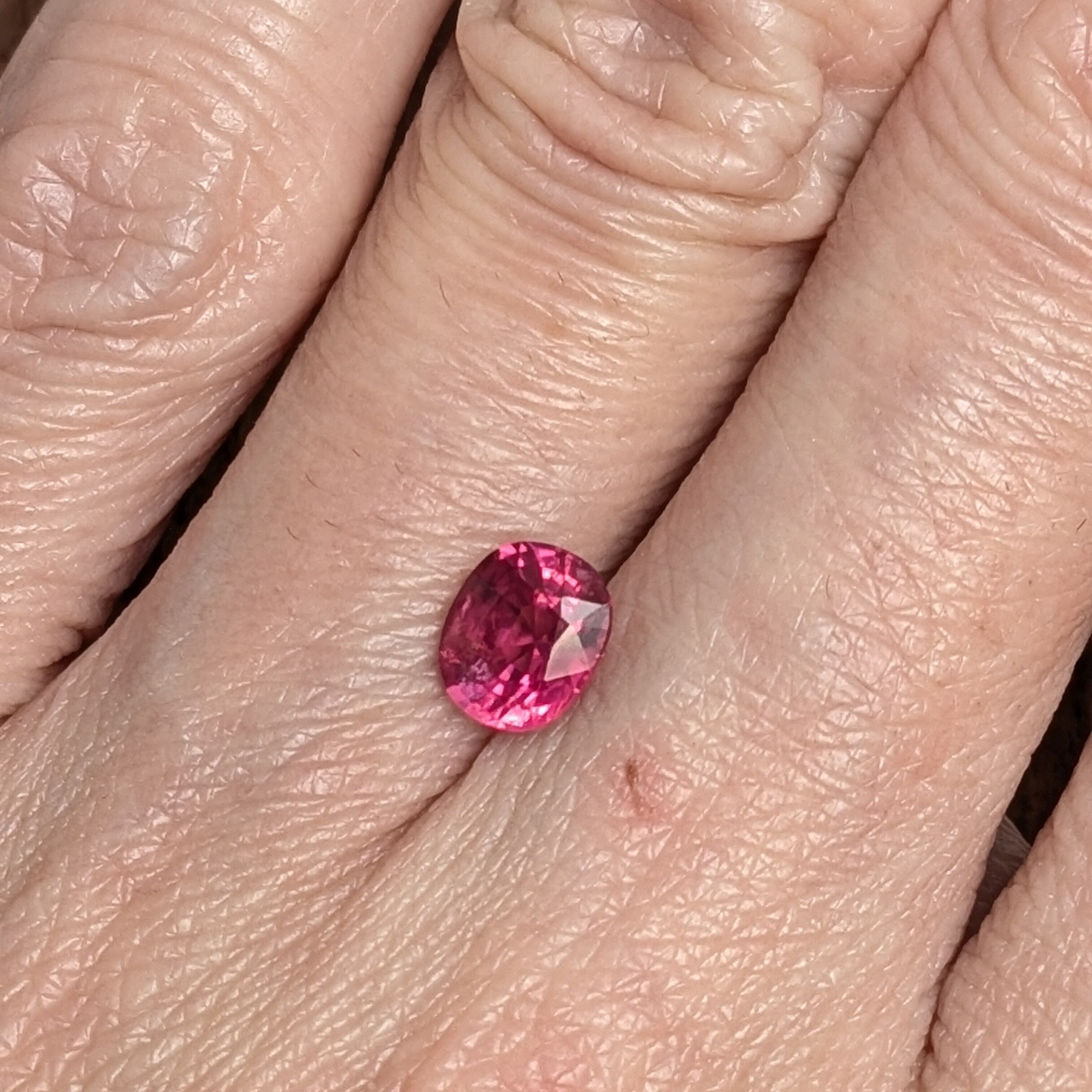 ホットピンク色…とは言えないまでも、若干ピンク色とオレンジ色と赤色が混ざり合ったような、彩度の高い可愛らしい色合いが魅力的な一粒。肌馴染みが良く、どんなシーンにでも使用できるジュエリーに仕立てられそうな色と輝きです。せっかくなら、贅沢にソリテールにしても良いかも☆