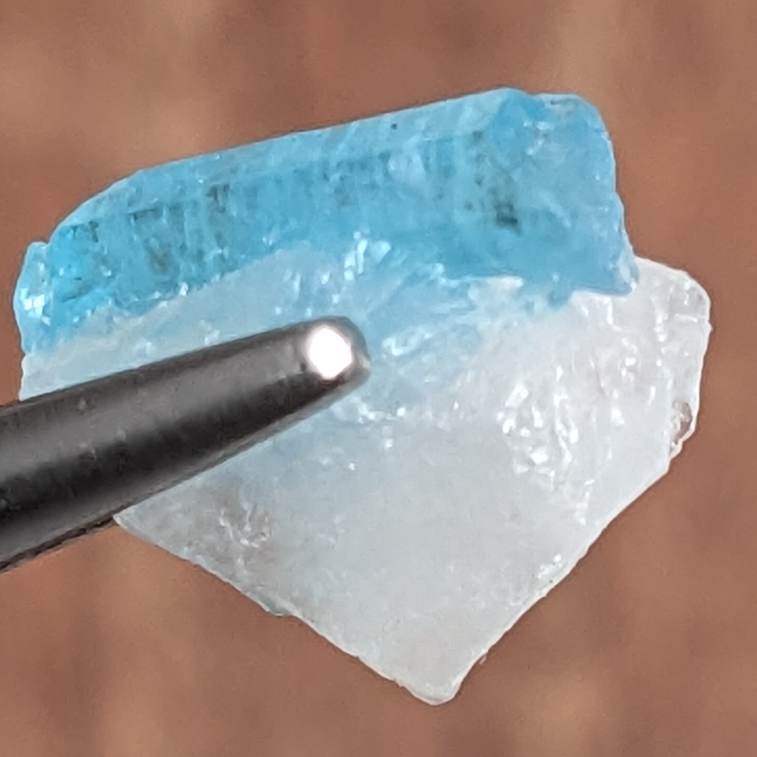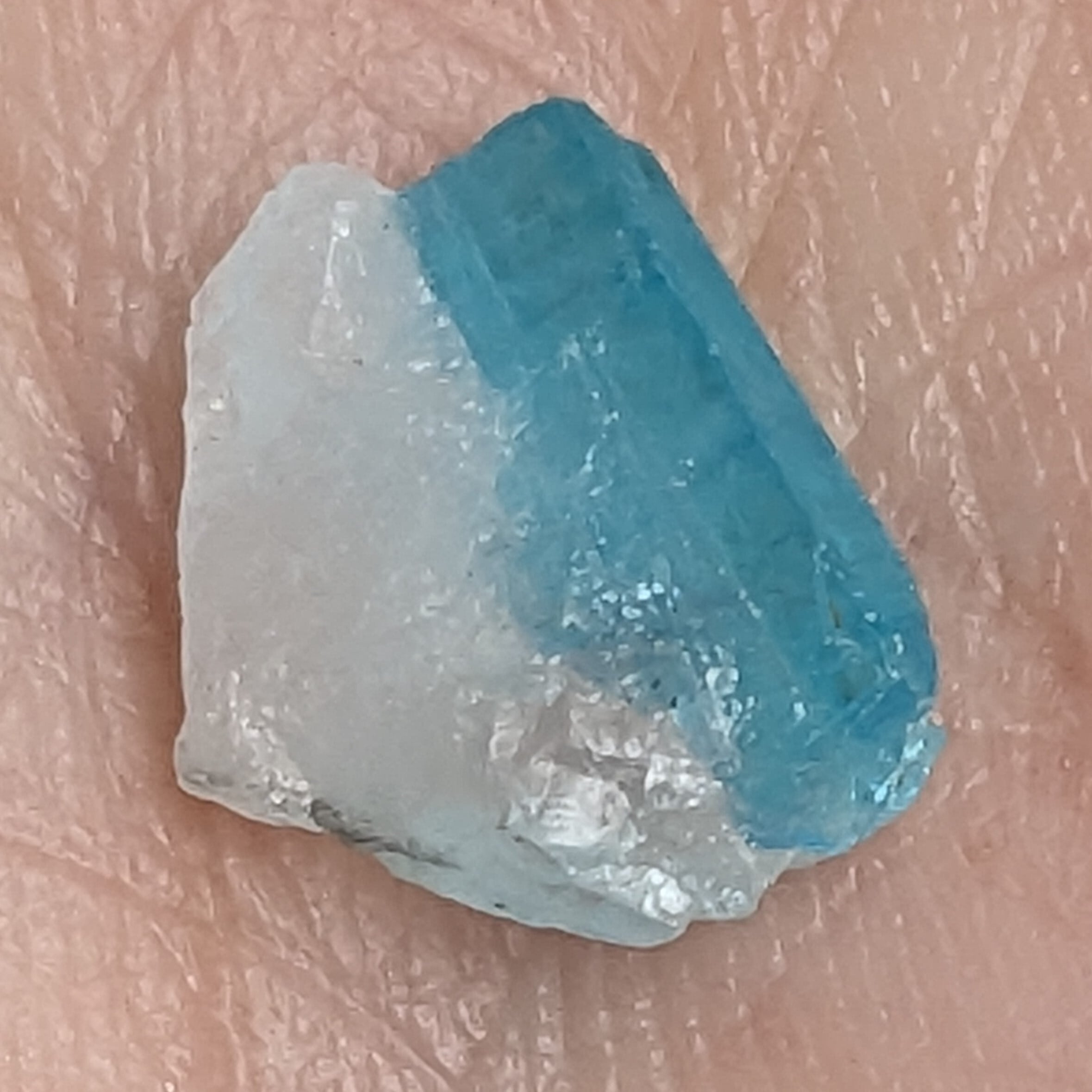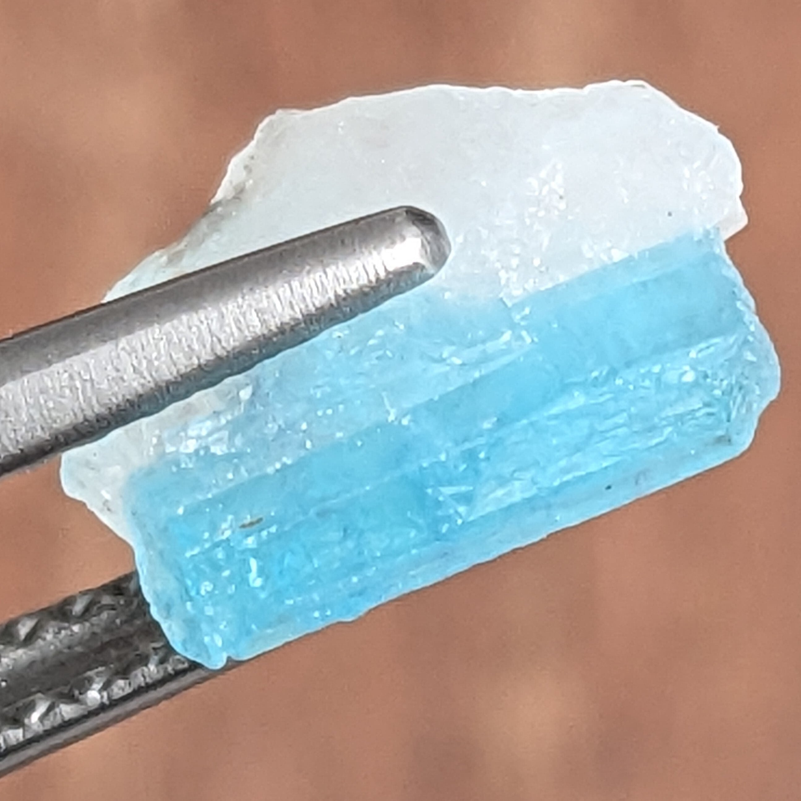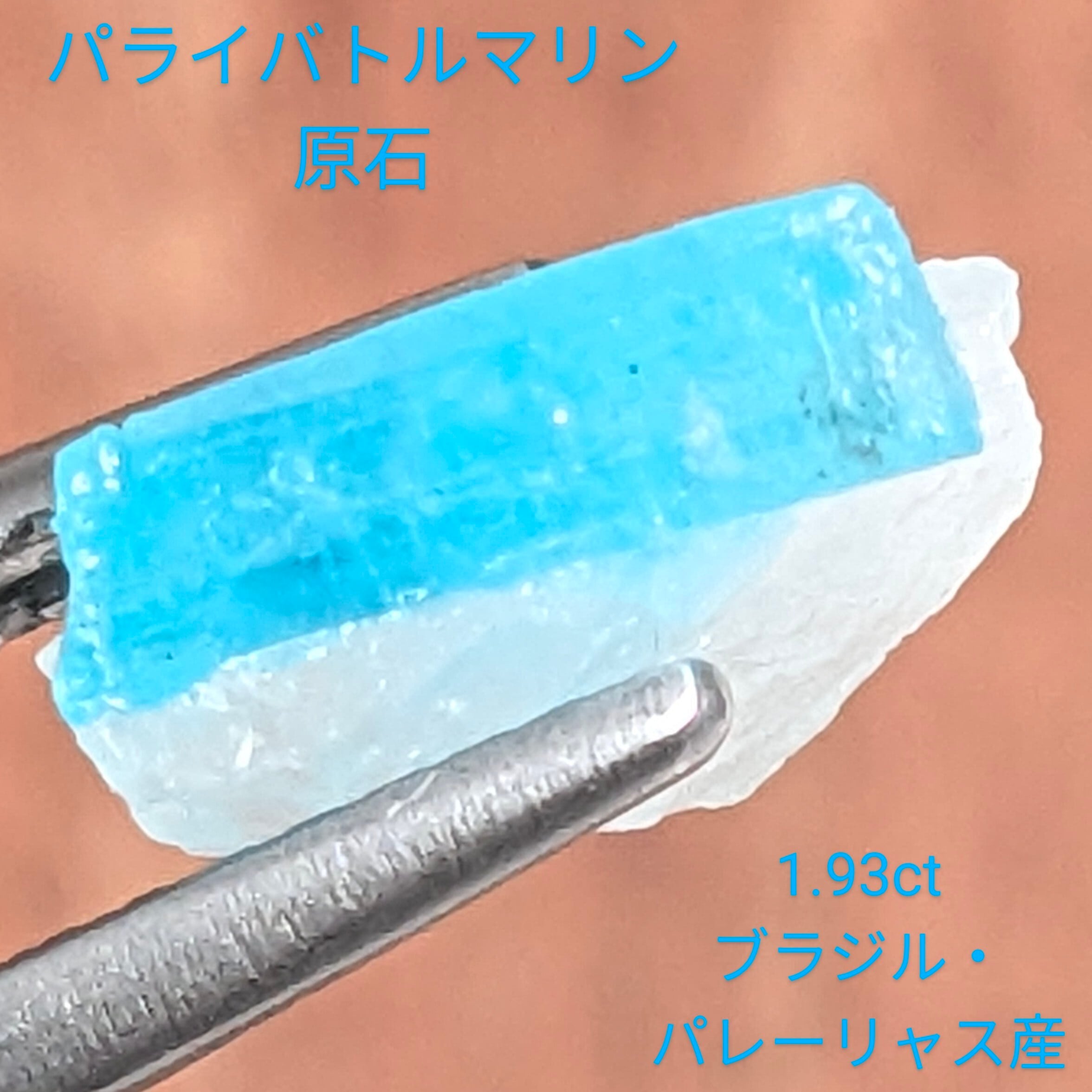 キャンディ・カラーのネオンブルーのパライバトルマリン原石が、原石の状態で母岩についている1品。鉱物好きとしても、宝石好きとしても、パライバトルマリン好きとしても、これだけ美しい結晶形がをしている原石は見逃せません。乳白色の石英との対比が、また幻想的で美しい♪