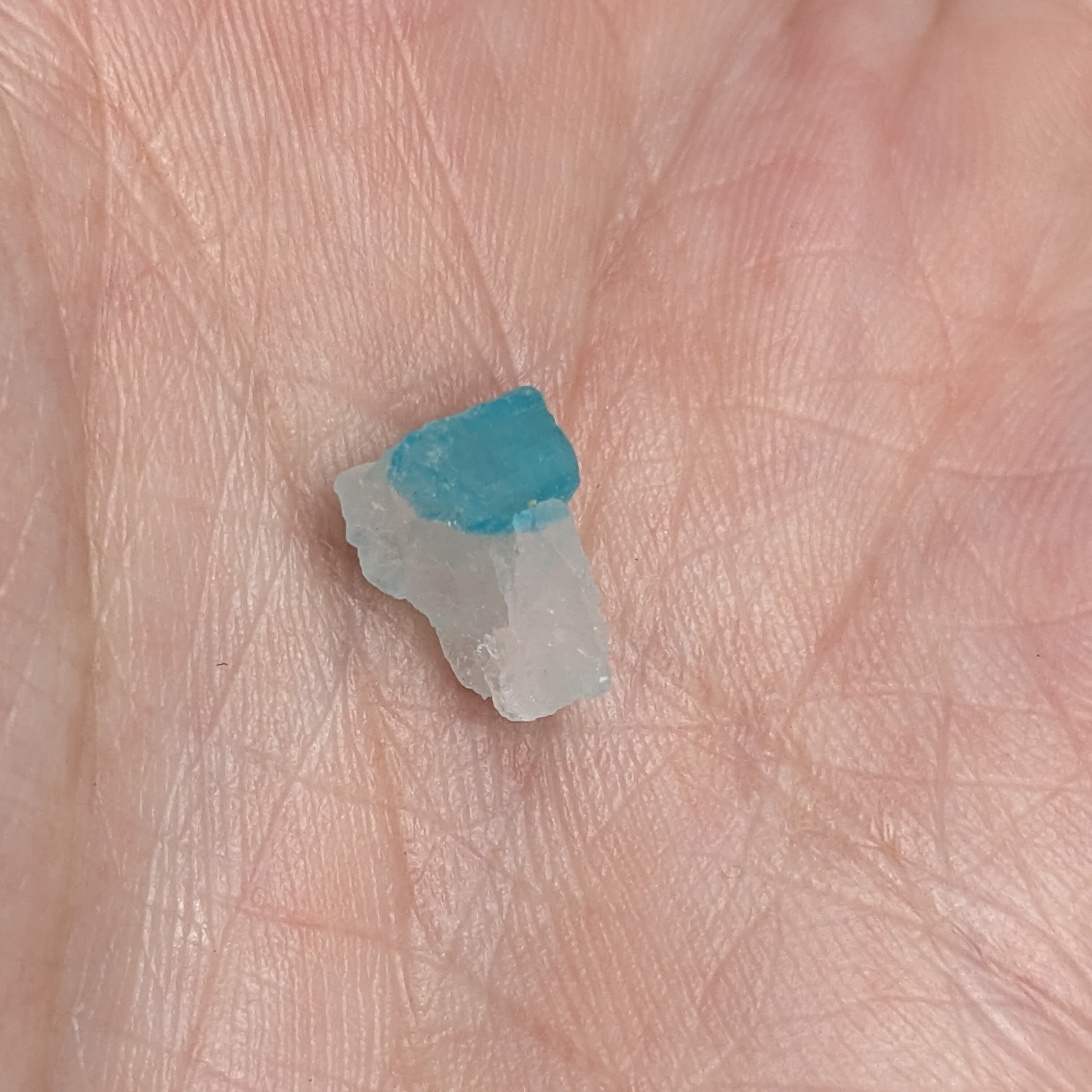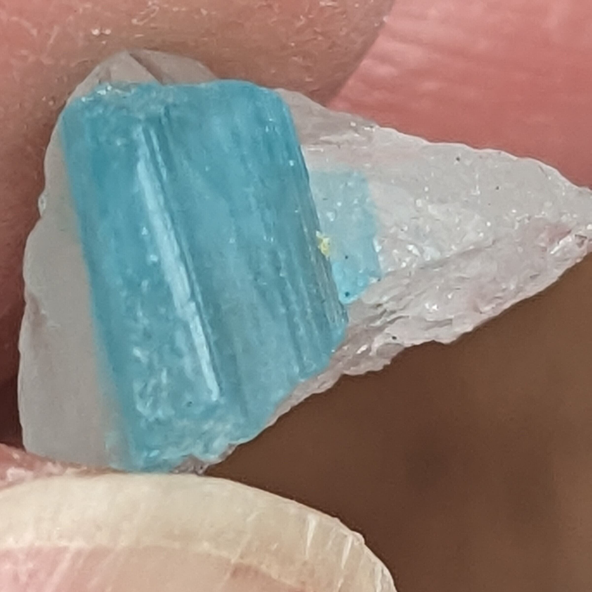 宝石や鉱物を専門にしていて、その成り立ちがだいたいわかっている立場にいても、こういった美しい結晶形を保ったものを見ると不思議な気持ちがしてなりません。淡い綿あめのような石英の上にちょこんと鎮座しているパライバトルマリン。四方八方から眺めて、「可愛い~♪」とついつぶやいてしまいます☆