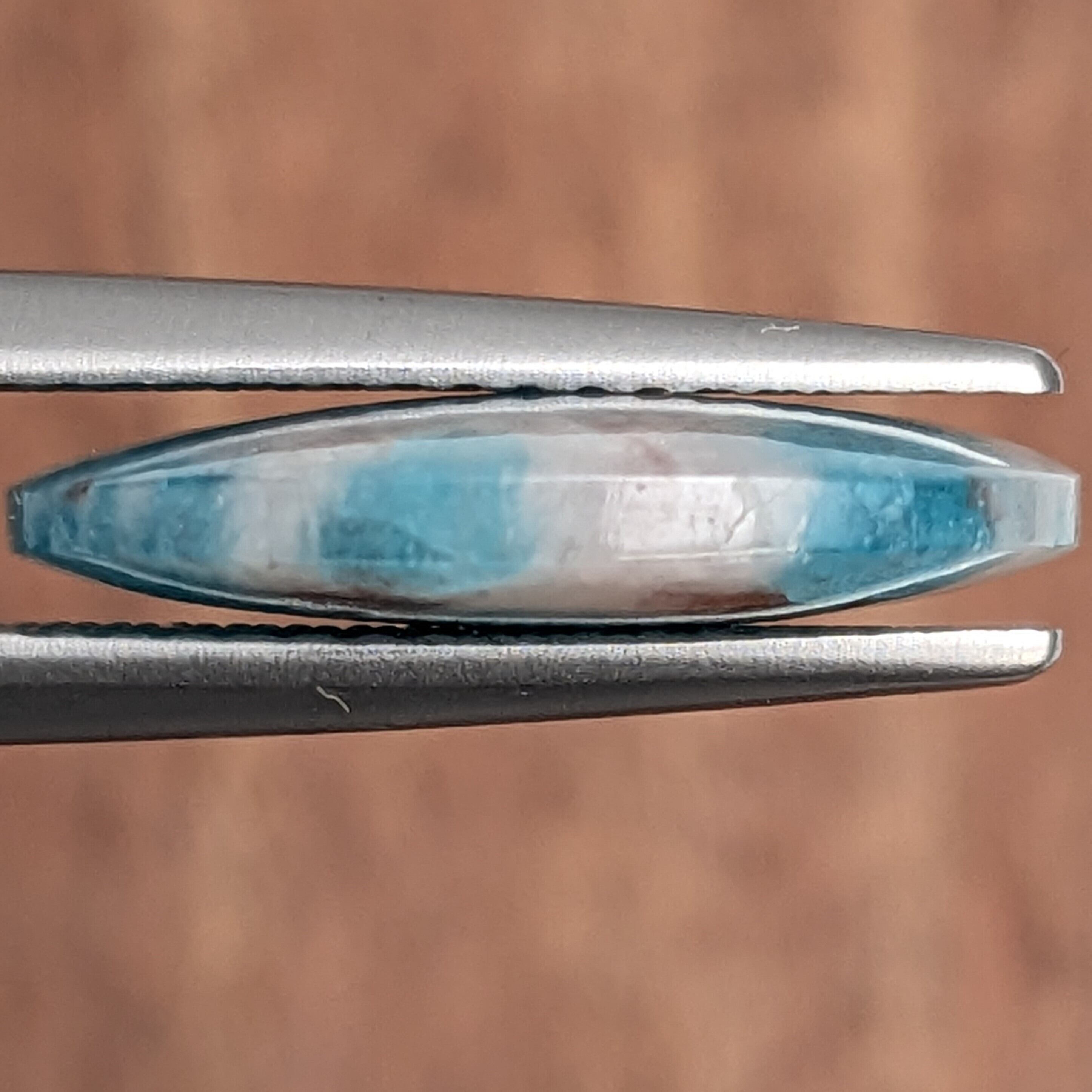「パライバ・イン・クォーツ」となっていますが、比率的にはほぼ「クォーツ・イン・パライバ」と呼びたい1ピース。一見黒いインクルージョンに見える部分は、ちょっと暗めのレディッシュ・ブラウンの結晶インクルージョンです。このタイプのお石は、是非模様も合わせてお楽しみください。