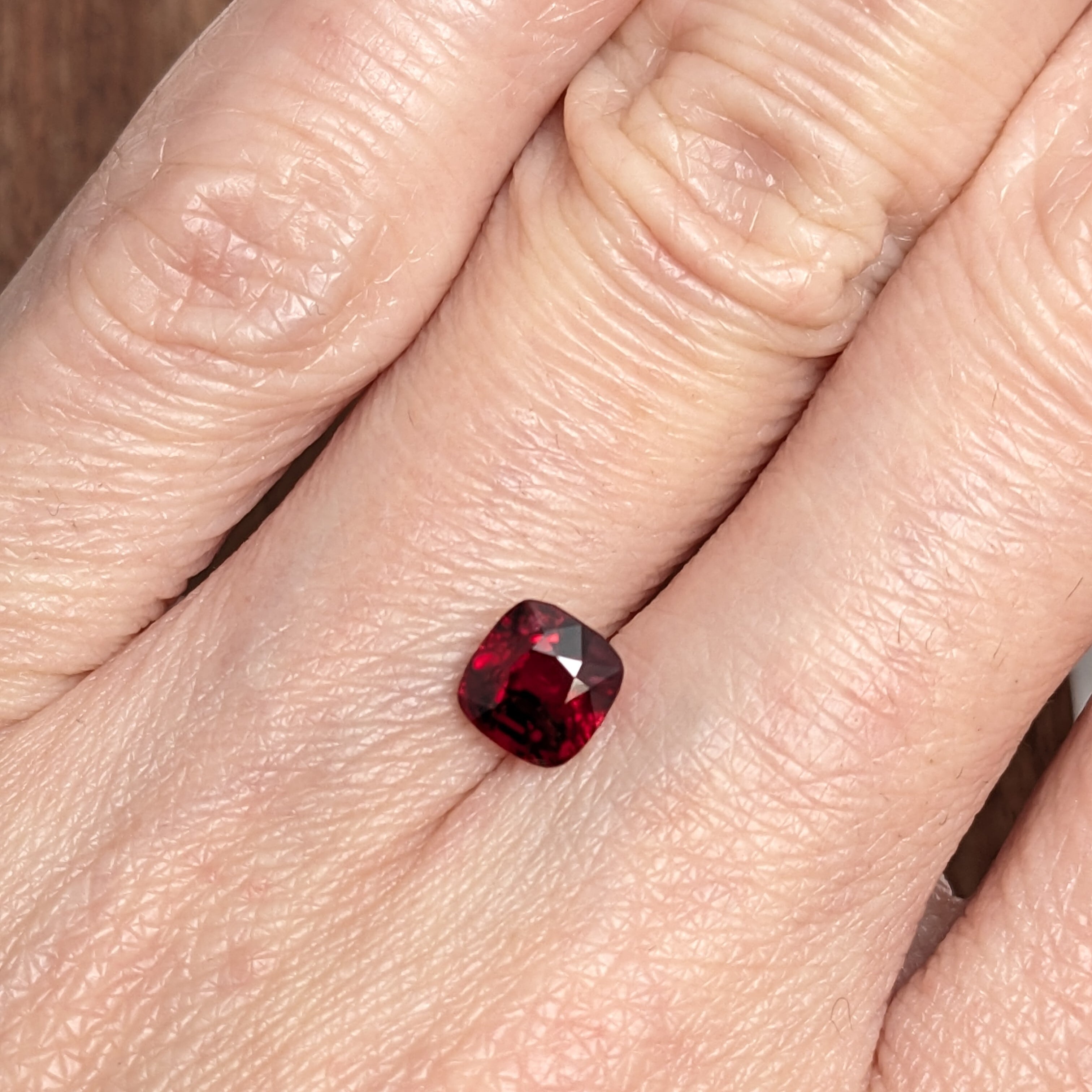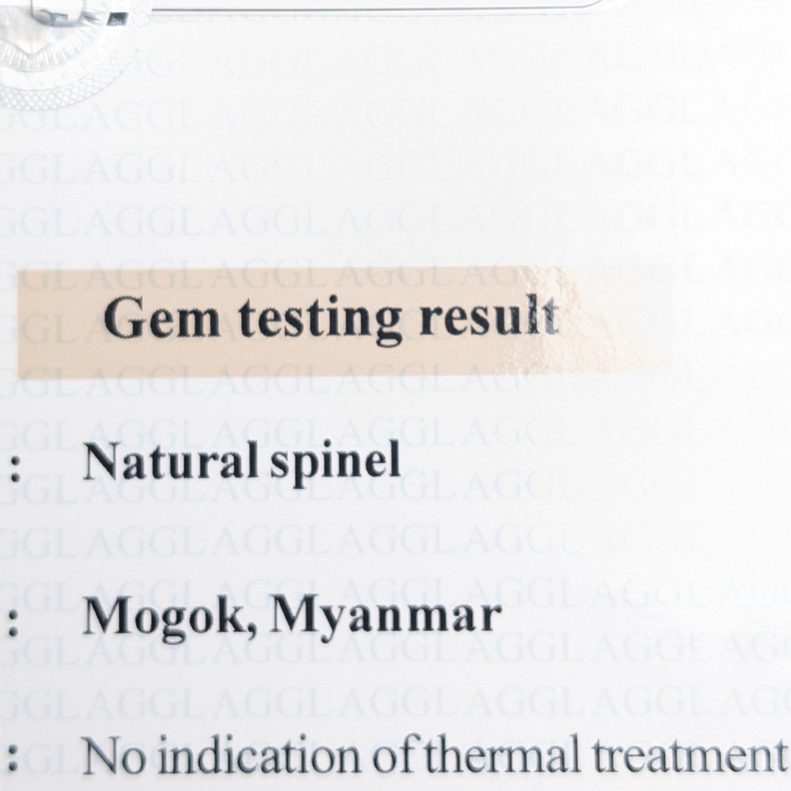 カラーのところには「orange red」となっていますが、肉眼での色合いは限りなく純粋な赤色に近いです。インクルージョンの中には非加熱のスピネル特有の八面体の形を保ったままの結晶インクルージョンもあり、美しくかつ天然の特徴も存分に楽しめる1粒。