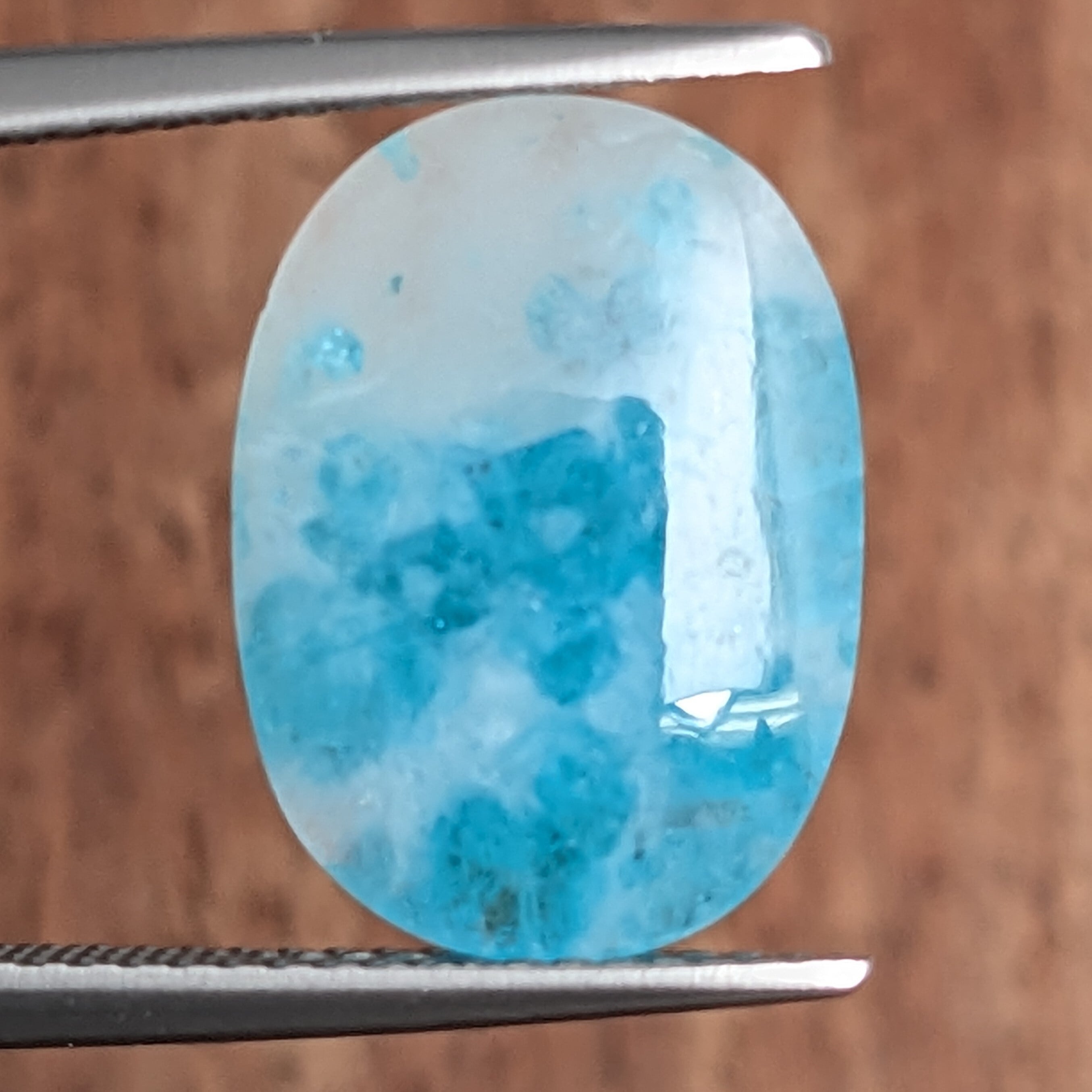 荒れ狂う大洋。白く曇った大空を背景に、飛沫を上げる生ける波々・・・。そんな情景を思い浮かべてしまうほど、白とネオンブルーのコントラストが印象的な1ピース。部分的に散ったパライバトルマリンの結晶がとても躍動的で、まるで水滴の音が聴こえてきそうです。ザザーン・・・!!
